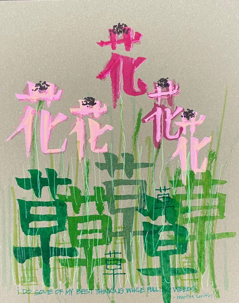 For this Scribbled Lives challenge I chose the words grass and flowers to illustrate what I experienced this week as I pulled grass and weeds out of my echinacea flowers. I used the Kanji symbols for each word together to create a sense of my weeding and the grass infestation…the never ending part of having a garden. The small text at the bottom reads: