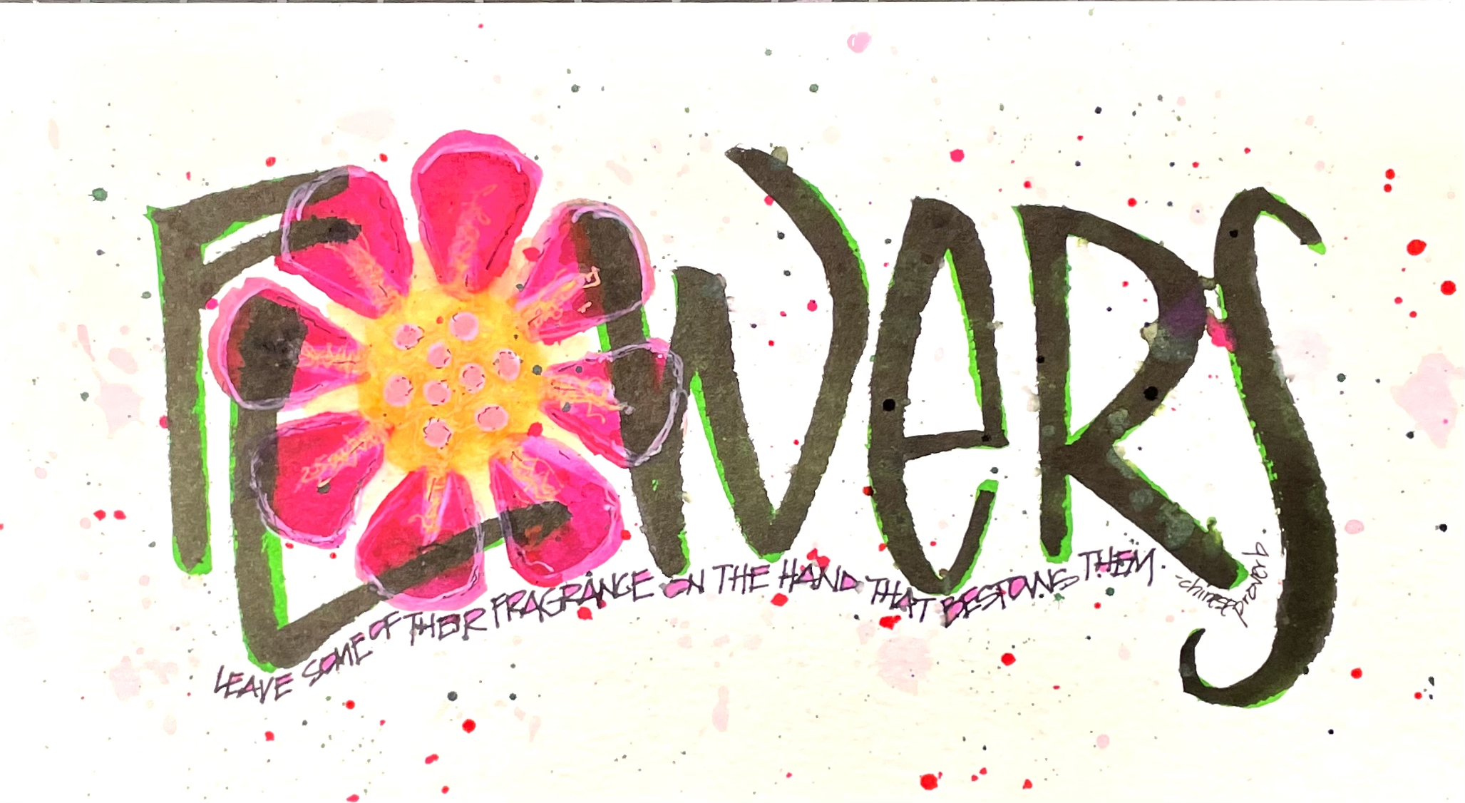 Believe it or not, it is week twenty-eight in Scribbled Lives and we were prompted to do something around the word flowers. I thought of this quote, as it is a beautiful cross-stitch my Mom did that hangs in our guest area. I actually ended up doing five or six versions of this piece. As I neared the end of each version I stopped before I finished as I did not like it. So I left it undone and moved onto another idea. I found myself trying too hard, overworking things, and trying to be some artist I was not. I took a deep breathe, created this version and liked it enough to consider it done.