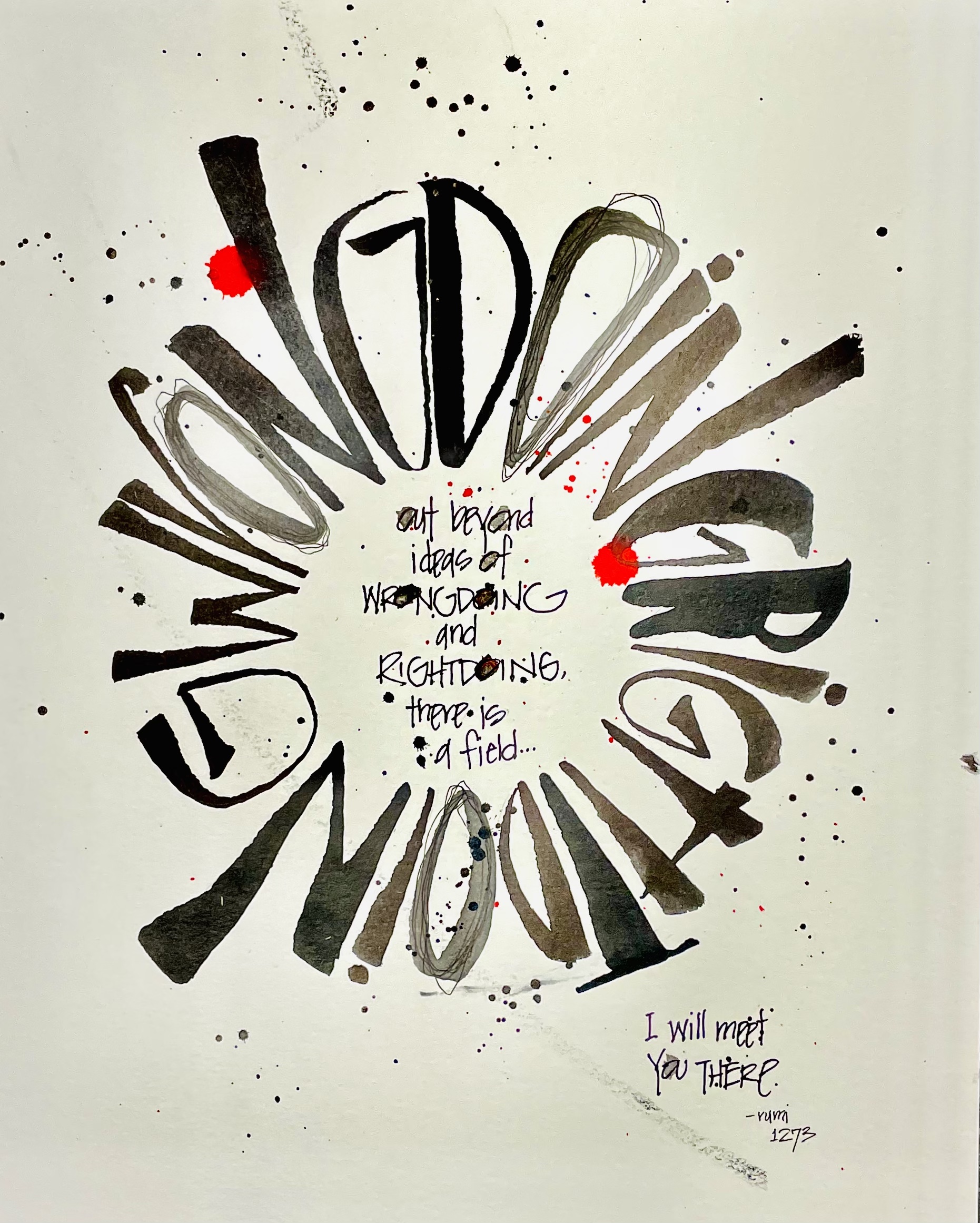 For week twenty-nine in Scribbled Lives we were asked to utilize words of wisdom from Rumi. There are thousands of options here, and when I read this one it stuck out for me. The ideas of wrongdoing and rightdoing bring out such strong options. I wanted to illustrate that point by writing the words in non-traditional lettering, maybe even more wrong than right, and finish the phrase “out beyond”. The smear were not intentional, yet they work with this piece.