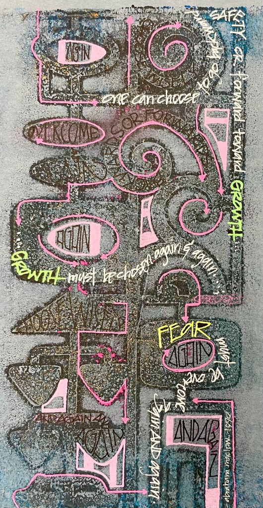 I like how the words twist and turn as do our emotions while we are making daily choices on how to live. Choosing growth means hard work, often leaving what we are accustomed to behind us while we steer straight forward into strange new lands. Or it means spending less time on comfortable things and more time on unfamiliar ones. However we grow, you can be sure it will be new, different, uncomfortable and sometimes a bit daunting.