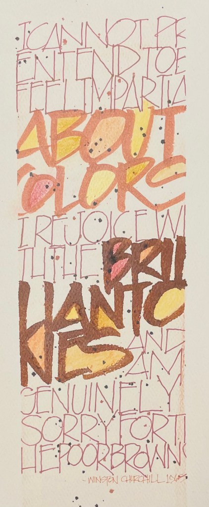 For Scribbled lives we were asked to create a piece around something we do not like doing or using. I thought about the things I don’t like to do, or don’t use very often and I thought about the color brown. Poor brown, not often first choice for people when it comes to wardrobe or decorating…and then I found this quote from Winston Churchill about brown: