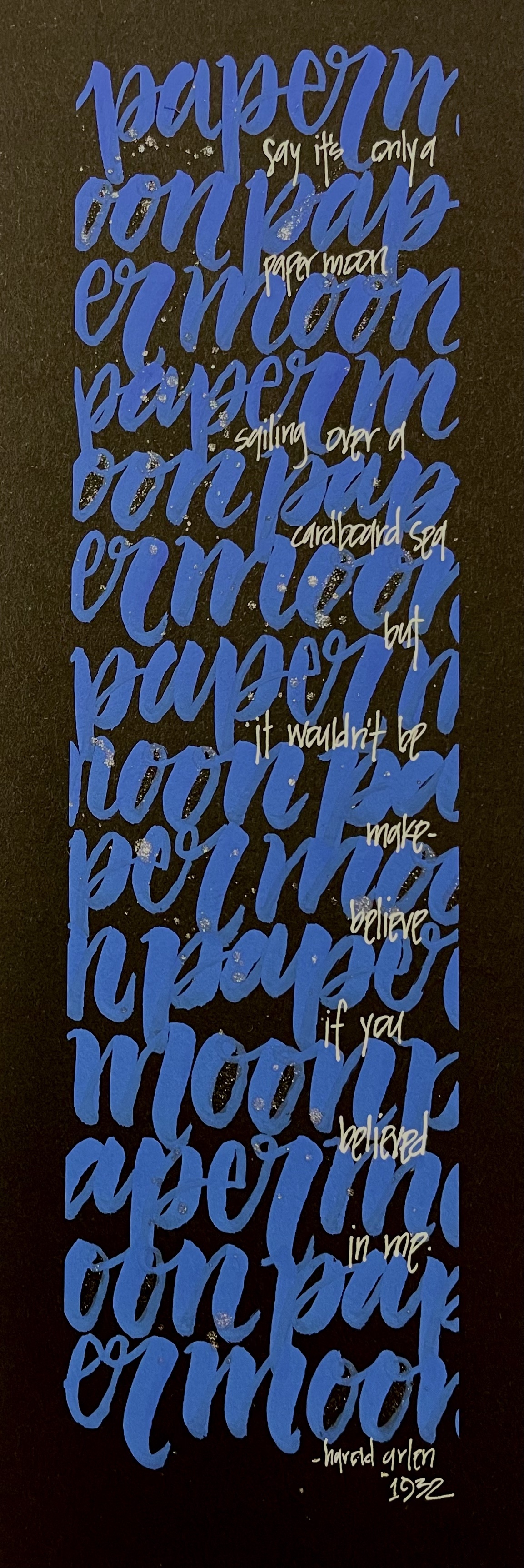 In Scribbled Lives we were given the prompt of The Moon, to create a calligraphic work of art around that topic. I thought of the theme song from the movie Paper Moon. I read the lyrics and imagined the moody, dark and mysterious elements of the moon and wrote this piece. The deep blue lettering was written with a Sharpie bleed proof brush marker, they were just released and are fantastic. I really like the contrast of the blue against the tiny white letters.