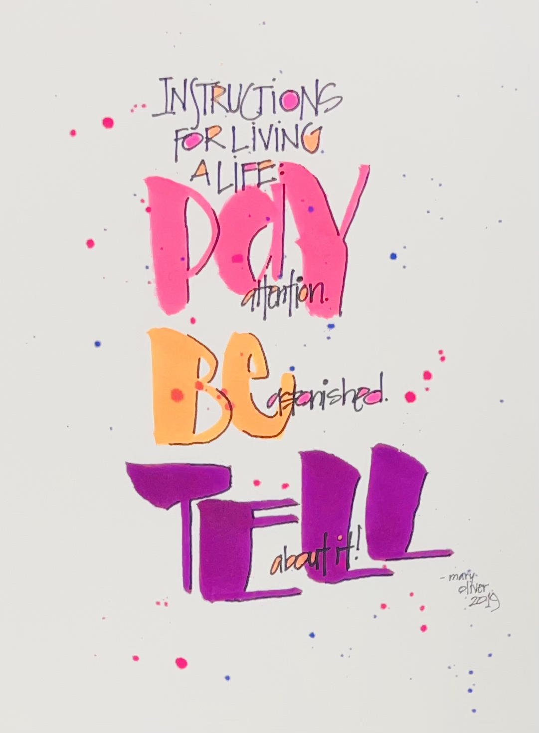 We are all better versions of ourselves when we take time to enjoy the world in which we live. The sights, sounds, even beautiful textures of our daily lives have the power to remind us that life is about paying attention, being astonished and then telling other people about it. Thanks to Mary Oliver for writing these words AND reminding us that life is more that just to do items, getting stuff done, climbing the ladder of success and being more than. Life is about small moments of wonder that have the power to change us forever.