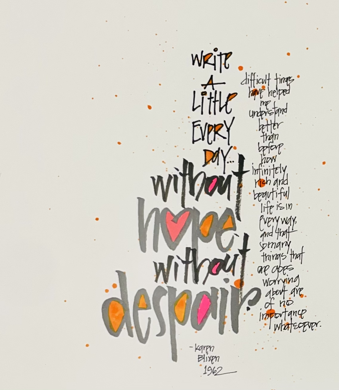 You may not know the name Karen Blixen, as she published under many other names. You do know her work. She wrote Out of Africa, Babette’s Feast, and several other novels and stories. She told us her story about owning a farm in Africa and changed our perspective about what a woman can do when she has no other options. I greatly appreciated these words from her about writing every day…without hope, without despair.