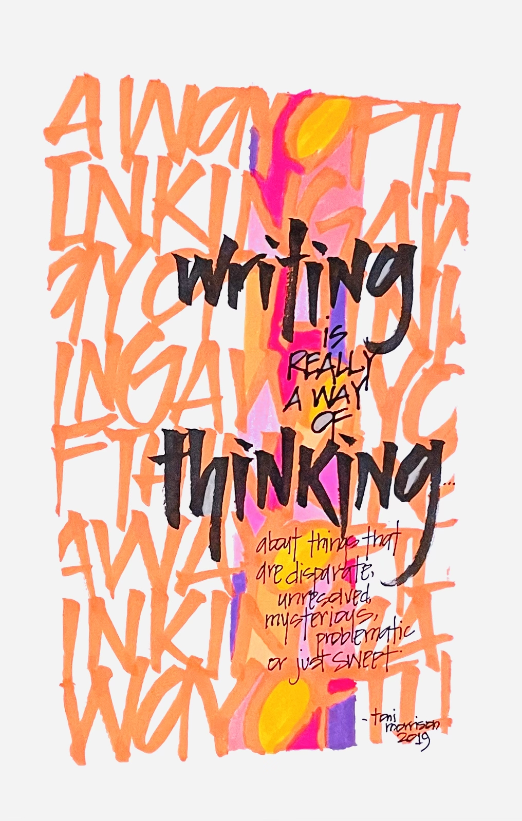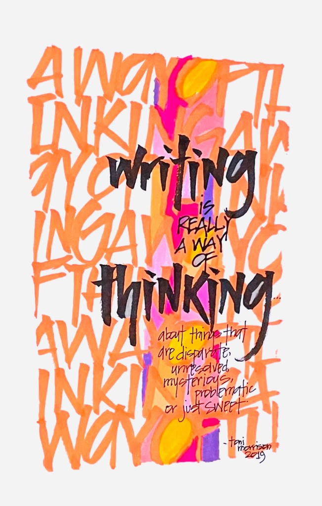 With all the stimulus we have – television, movies, videos, the internet, podcasts, activities – there seems to be very little time to think. To actually sit still, in the quiet and process our thoughts, our day, even our emotions. We’ve become so busy that we are too busy to think. I see the impact this lack of thinking has on us all and I work to negate that challenge in my own world. I set up spaces to think – where there is no stimulus or phone charger. I turn off the tv and I set aside time to do nothing but think. I may think when riding or walking, creating or mostly when I write. And yes, Toni Morrison, writing is a great way to think.