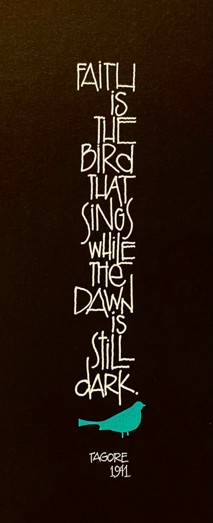 These words from Tagore always bring me hope. Days, nights, weeks , months even years may feel dark. EVERYONE feels that way at one time or another. You are not alone, crazy or a disaster because today your day is dark. If you want things to change, and I say IF because sometimes being stuck is what we want rather than doing any work to make things better. IF you want the darkness to dissipate, time to employ faith. Faith is the bird that sings while the dawn is still dark. Faith is believing even though you cannot see it that a greater power is at work. Faith is knowing that morning will come, the sun will rise, and the day holds infinite possibilities, even as you chirp away in the darkness. Faith is believing that things beyond your control can happen, will happen, do happen AND that you have the power to keep going. Faith is acting AS IF anything is possible, even as you face circumstances that make you feel nothing will change.