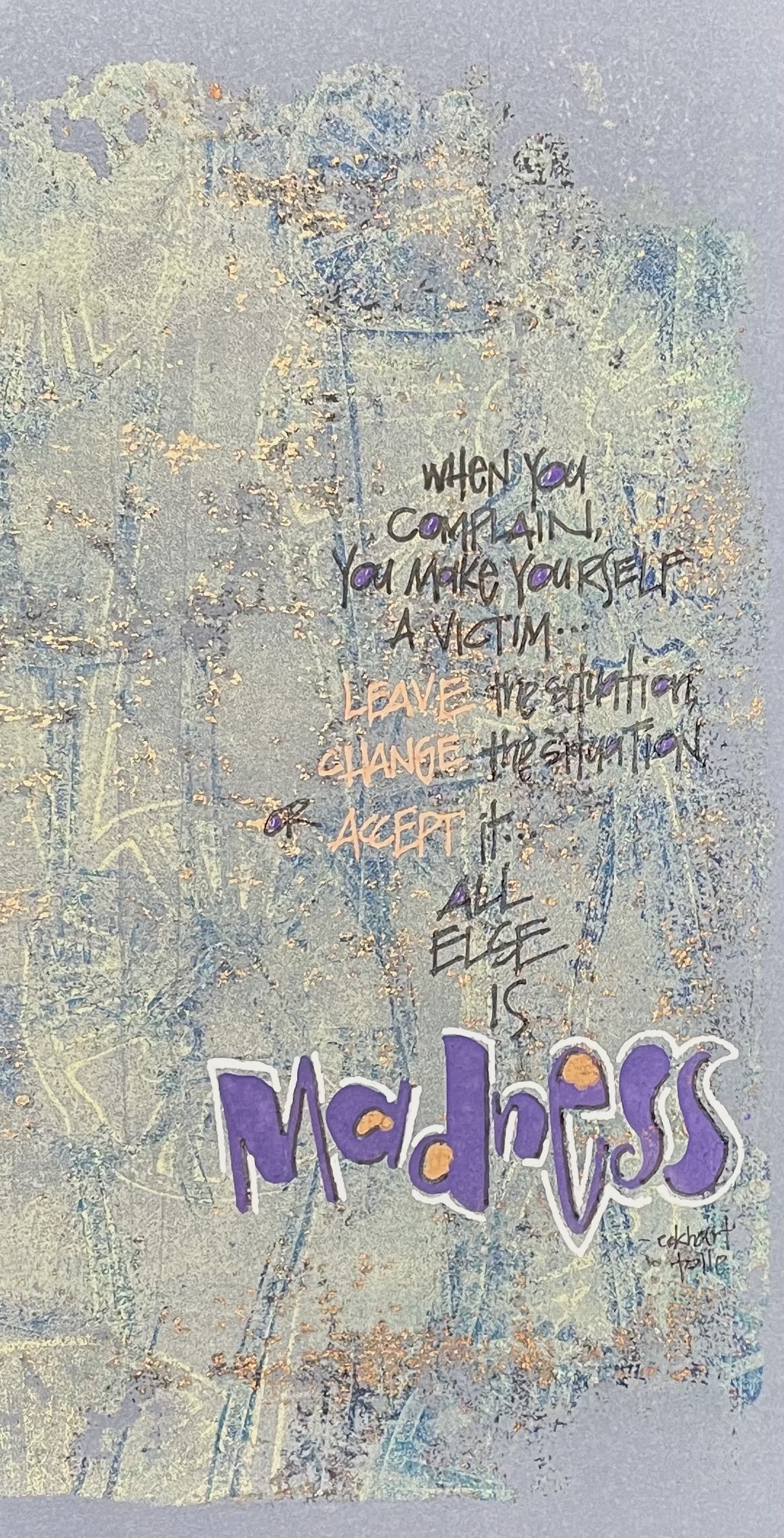 So there is a choice we have to make each and everyday about how we are going to fend off madness. The anger from irresponsible people and their dumb choices. Dismay from the irresponsible things we have done or how the actions of others have impacted our world. The disappointment in people who let us down. Even those unexplainable, random happenings that seem to suck the life out of our day or week. We can leave, change it or accept it…otherwise we are choosing madness. Which means we are willingly giving someone else power over our life simply by choosing not to choose…which is madness.