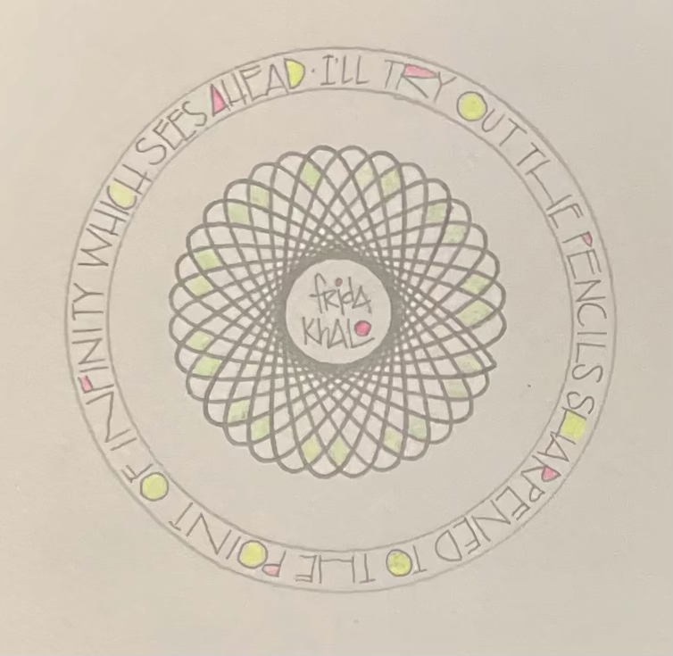 For Scribbled Lives we were asked to create something only in pencil. No illustrations, just words. I do not produce a lot of work in pencil, to me it is a rough draft tool…so hhhmmm, what to do? I then thought about my cool Spirograph set and sharpened my pencils so their tips would fit into the holes. HURRAH! It worked. I found this quote from Frida Khalo about pencils, and put the two pieces together.