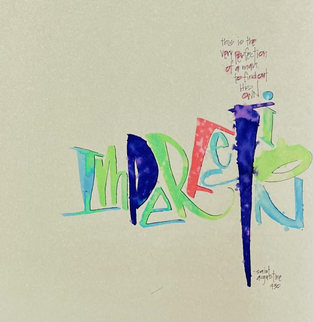 Oh what an awful day yesterday! Between the IRS, Health Insurance, the Post Office and Banking errors, I had a terrible, horrible, no good day! It is as if everyone was plotting to test my patience and deliver as much red tape as possible, while very little got resolved. Some days it is harder than others to be an adult. I created this piece of calligraphy and had wonderful thoughts I wanted to write about how we all must face our own imperfections and still strive to be a better version of ourselves… and then that call with the IRS really did me in! I will have to call back – again, (issue still not resolved) yet all I can do at this moment is laugh. I did indeed find out about my own imperfection today!