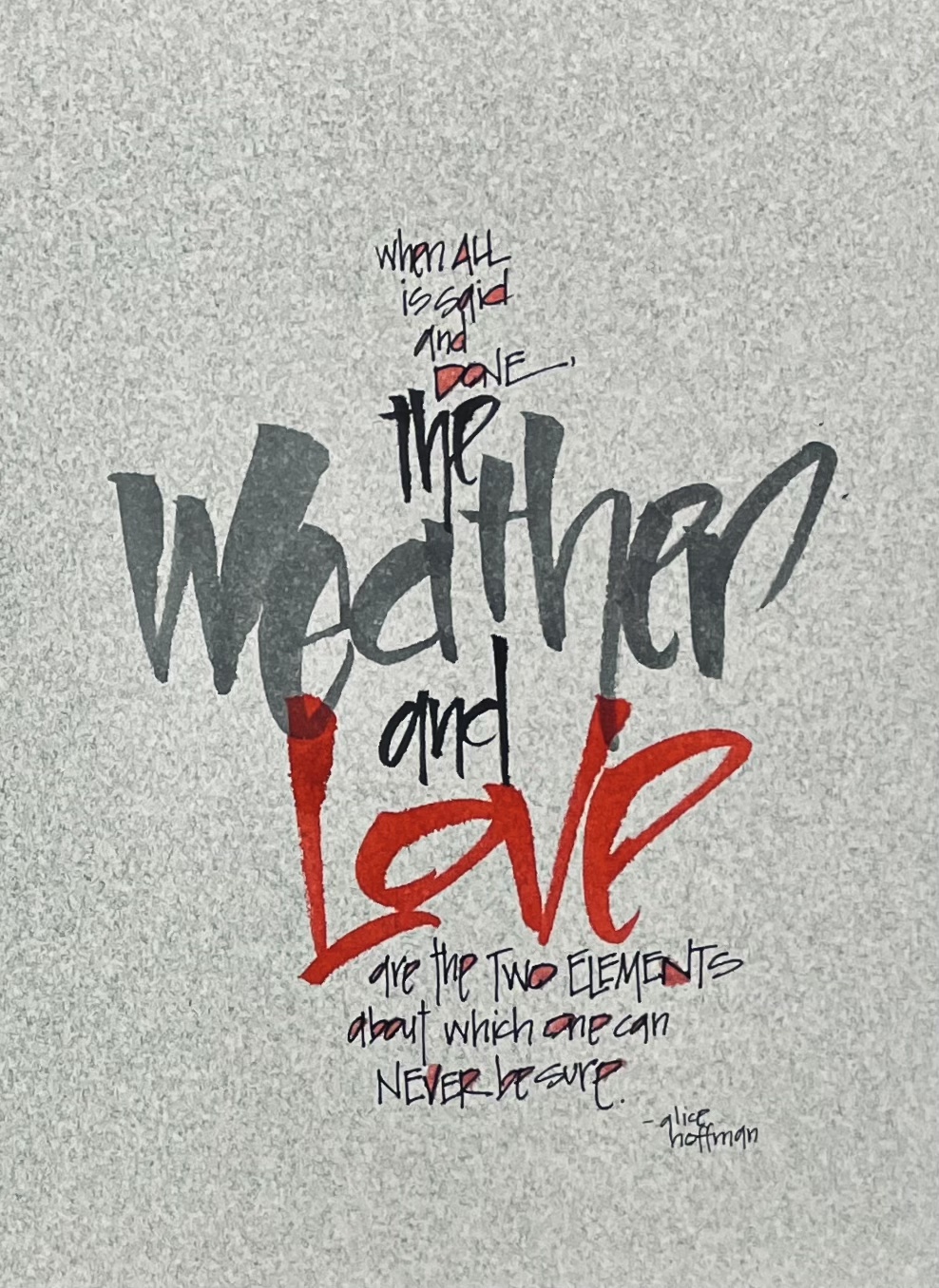 I found these words from Alice Hoffman about the weather and love oh, so true! Just as the weather changes sometimes everyday, so love and relationships can be fickle, frantic or frenzied! Both have a great impact on our lives, and yet we have no control over either…no matter how we have deluded ourselves. Yes we can be in love, feel love, and enjoy the beauty and majesty of love…but love can be fickle. It has mood swings, highs and lows, just like the barometer. One day you’re sunny and bright, the next day there are clouds and drizzle. Love can overwhelm and destroy us, bring us back to life and cut us to the core. Be it the love of family, friends, or even romantic love…love is truly unpredictable. And yet, love is what can make any day better than the one before. It has the power to push us forward to places we never thought possible, while reminding us that love and our emotions are a blessing we live with each and every day.