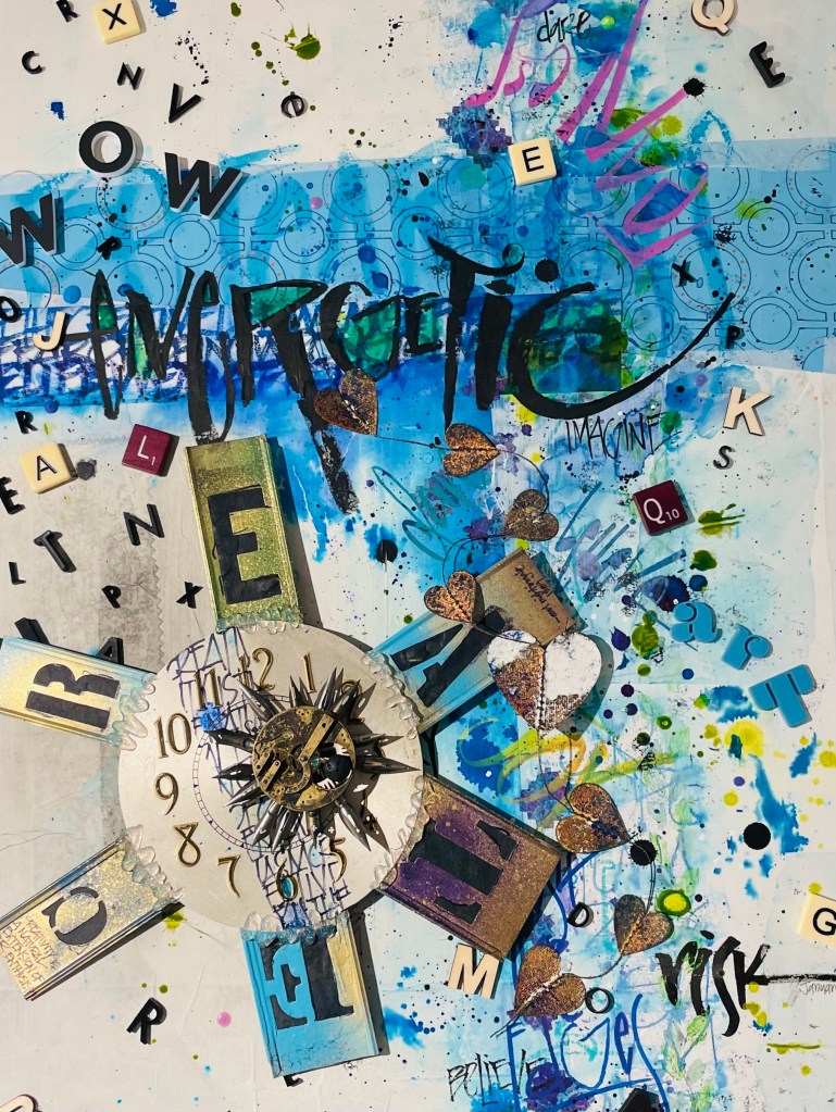 Many moons ago I started designing this background. I started it on one of our Play Dates. It sat for a long time in my studio waiting to be completed as I did not know how to finish it. As I chose the word create for my word of the year, I decided to finish this work and get it done. I utilized ink, acrylics, Scrabble pieces, antique calligraphy nibs, old metal stencils, clock pieces, paper scraps from some of my mixed media work, and even splattered spray paint. Whew! It was a lot and a lot of fun! I like the end result and look forward to finding a place to hang it up.
