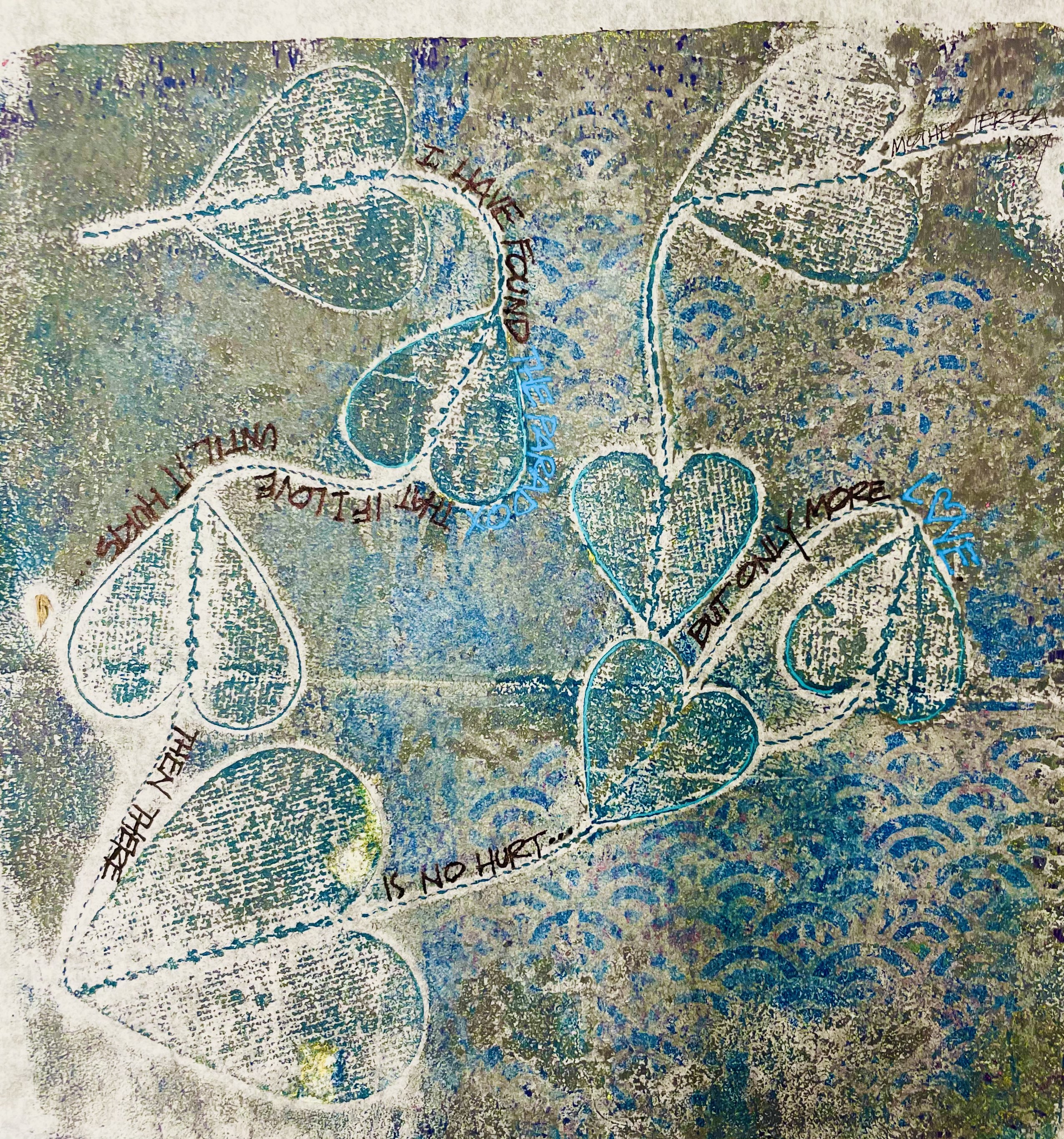I was in an antique shop and found twenty-nine yards of sewn paper hearts. They made a beautiful string of garland, and I utilized them as a mask when I was gel printing. Here a few inches have been incorporated to make the heart patterns on a monotype print. When I read these words from Mother Teresa, I knew the print and the words had to go together.