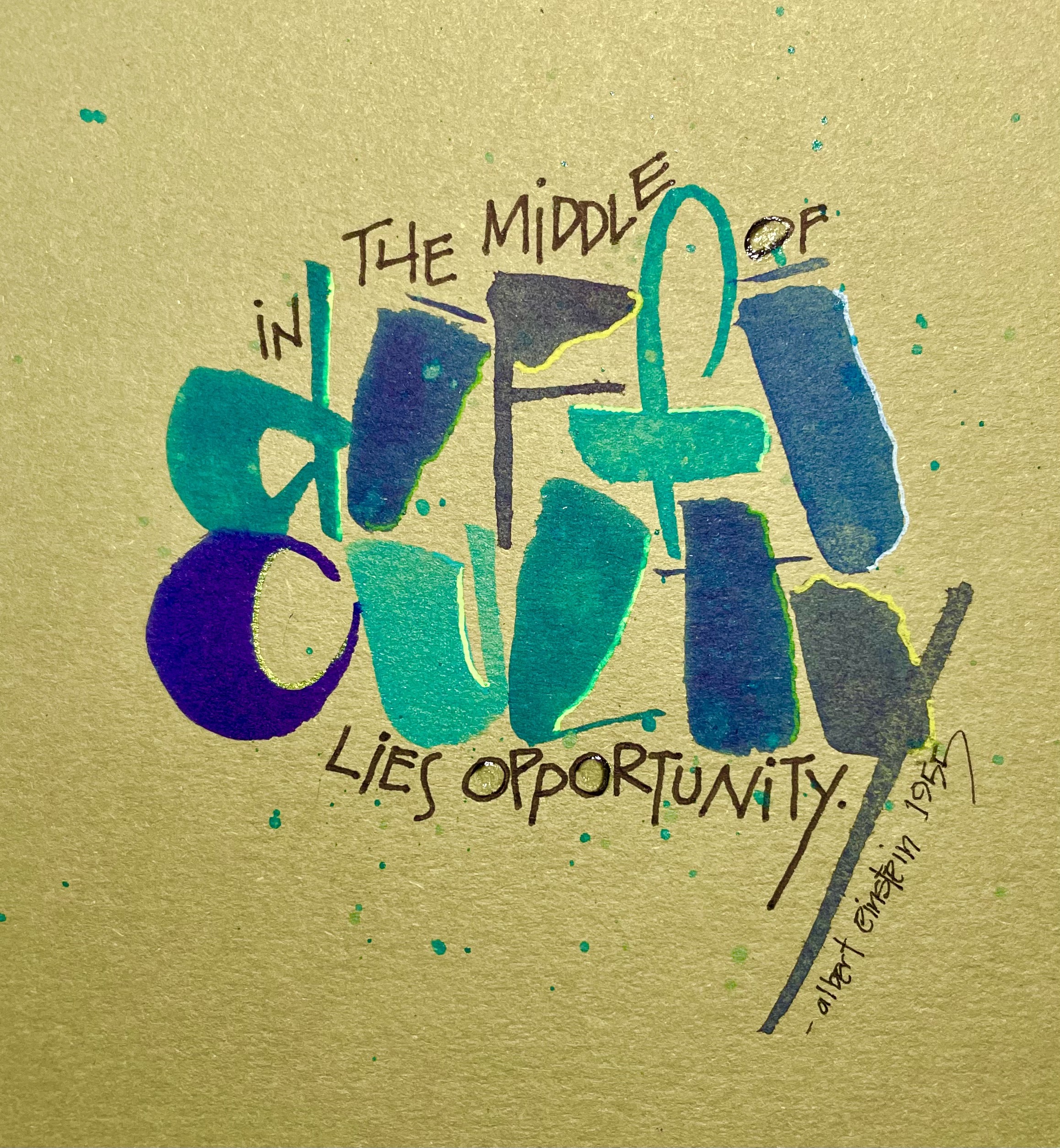 I moved a portion of my studio into our living room in order to stay on track. Tables are piled with books and supplies so that I do not have disrupt the “fan kingdom” that is our creative spaces. I found these words from Albert Einstein and took great comfort, as I agree with his insights. There is the initial shock of the difficulty, and the ensuing negative emotions, words and reactions. Once that slows down, repairs begin, and people do their jobs…there is that shiny flicker in the corner beckoning you towards opportunity. When you can see the future a bit more clearly, there are great things that can happen.