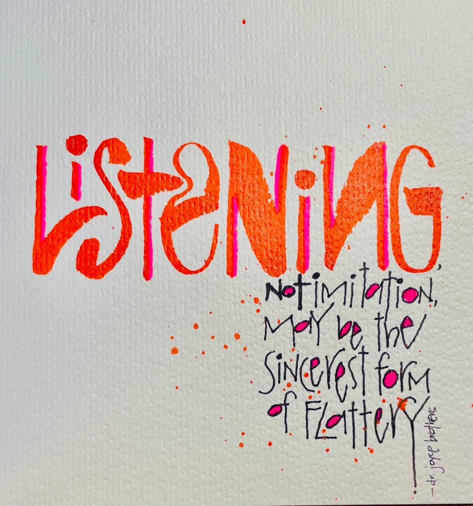 Interesting and interested…not an easy combination to find in friends. When I read these words from Dr. Joyce Brothers, I knew EXACTLY what she meant. Anyone can commiserate with your experience, understand your plight, or even share a story of their own that trumps yours…but people who truly listen, they are rare. What a feeling it is to know that someone gets you AND cares to stick around and find out more. Listening or being listened to is the sincerest form of flattery, and more importantly, the most important part of friendship.
