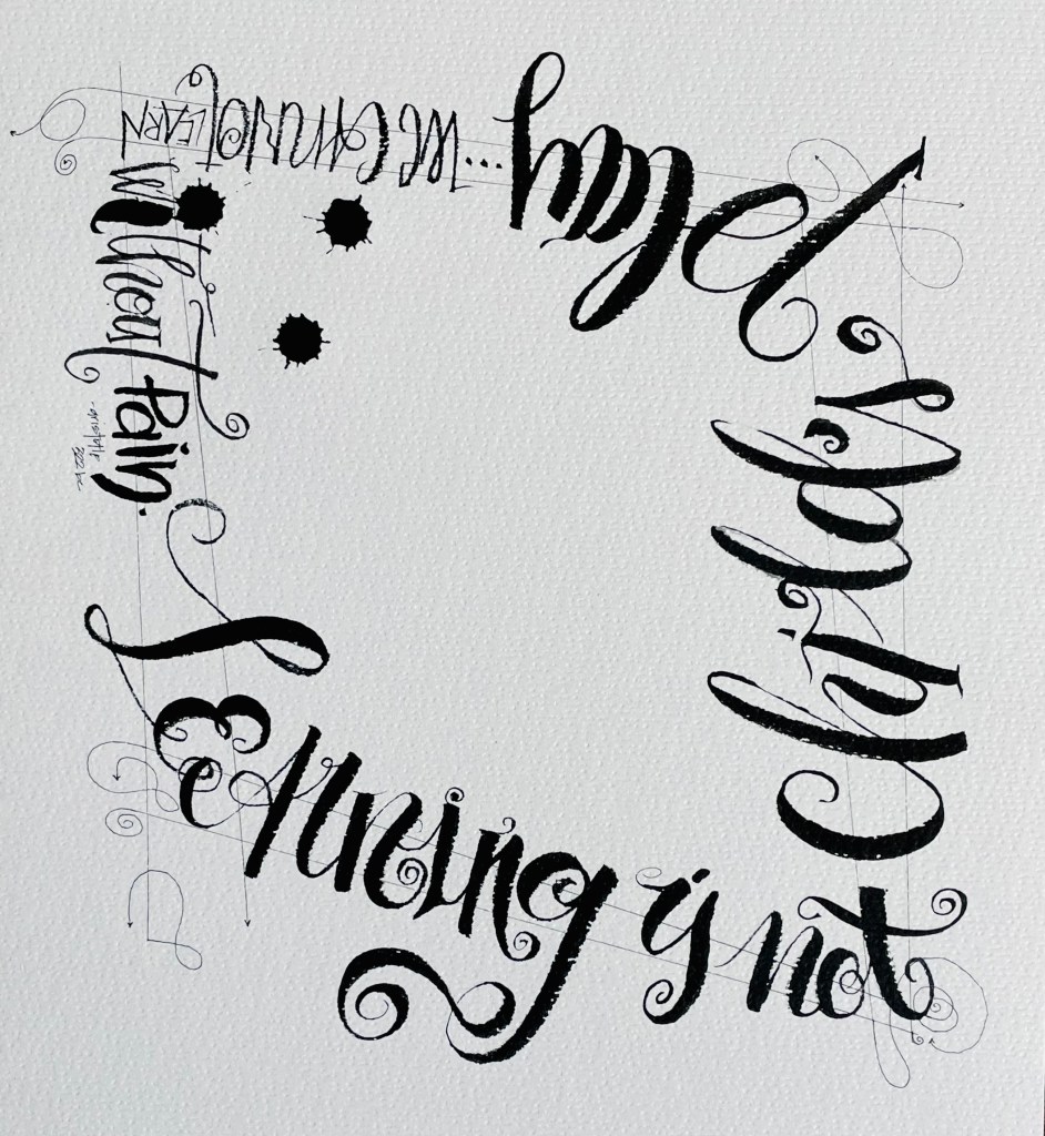 So I lettered on and created this piece with more than a few attempts (four actually) until I got the words to fit the way I wanted with some forms of flourishing. The three ink drops were indeed drops from my pen…it just so happened that the third drop landed right above the “I” in without. I mean I’m good with splatters, not always THAT good!