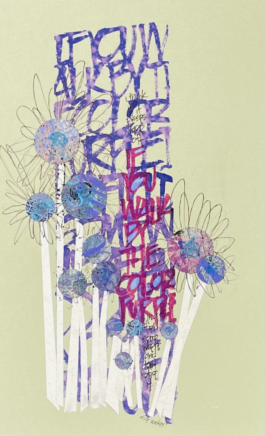 For our online group we were challenged to create something utilizing the color purple. Since Spring has sprung, I thought of flowers. I also thought of Alice Walker’s fabulous book The Color Purple. I wrote the quote in large letters with a dark purple ink, then wrote it again a bit smaller with a different shade of purple. I wanted to somehow add more purple and texture, so I utilized a hole punch to cut circles from gel print scraps. The stems are leftovers from handmade paper I made from dryer lint. I stopped working , took a step back, and it still needed something. So I used a very fine micron pen to create the petals. I wanted this to be an interpretation of her words, not just pretty lettering. Here is the quote: