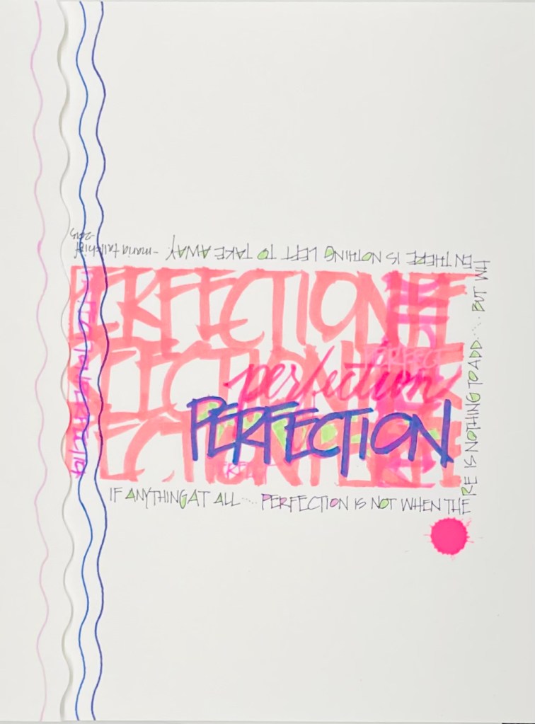The photo of my art does not reveal my secret. The wavy lines on the left side hide a mistake I made, so I had to cut the mistake page out using a wavy pair of scissors. I then redid the piece on the next clean page which makes the way drawn and cut lines look intentional. I think this mistake is the perfect secret to revel in a post about perfection. Nothing is perfect, no matter what your Mother tells you, no matter how the photo looks. Being able to make a mistake, learn a way to improve something, or even being strong enough to be your genuine self – THAT is the path to happiness and contentment. So today I wish you the ability to see your inner beauty and courage, no matter what. Be proud of who you are and let go of striving for perfection.