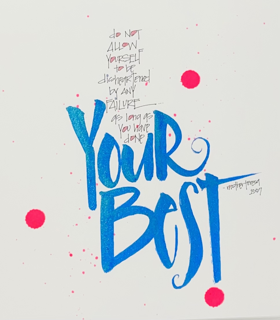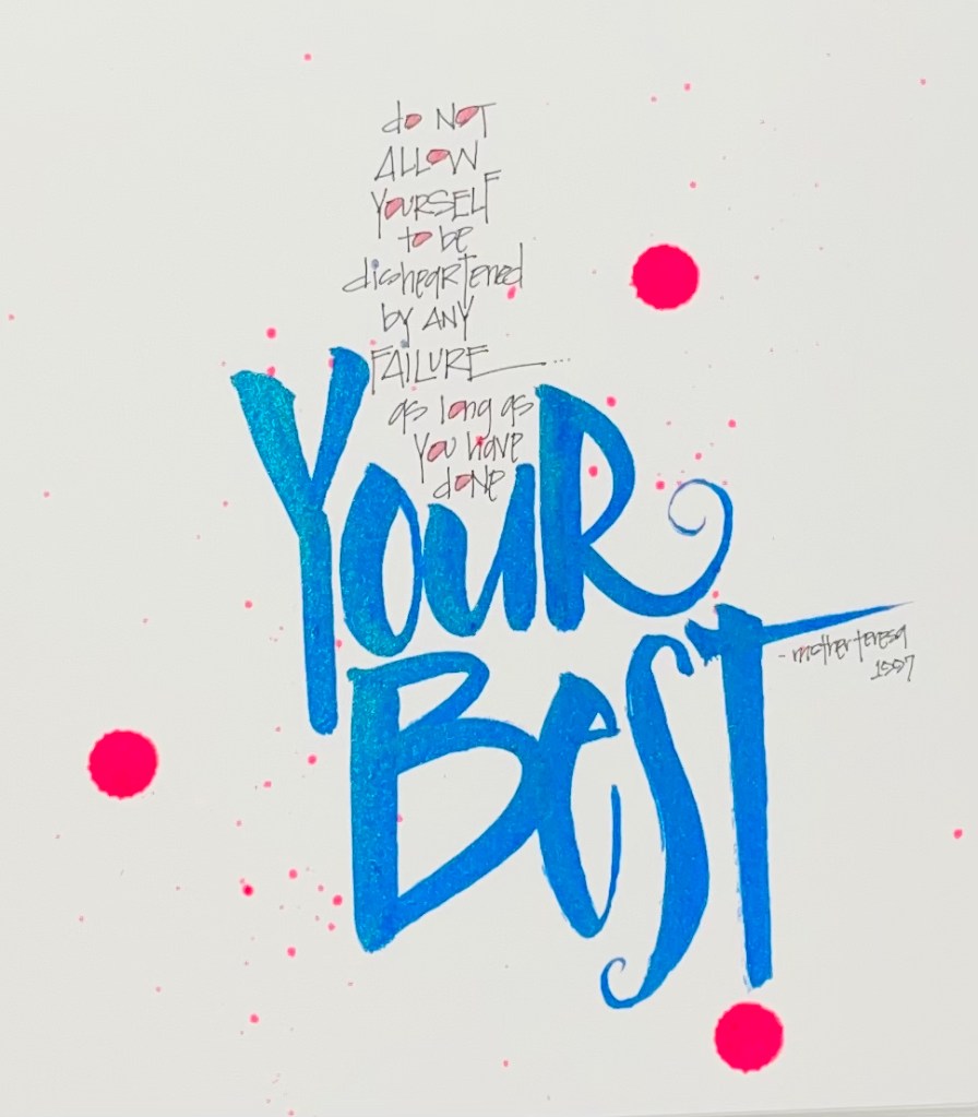 I am halfway through sharing the pieces I included in the book I created for my friend Maya. She is a bright, talented, motivated young woman who is leaving home for the first time to go to college. As I have reviewed the pieces I created (over 30), I noticed that several touch on the same topics yet from a different perspective. These words from Mother Teresa remind us about the importance of doing your best: