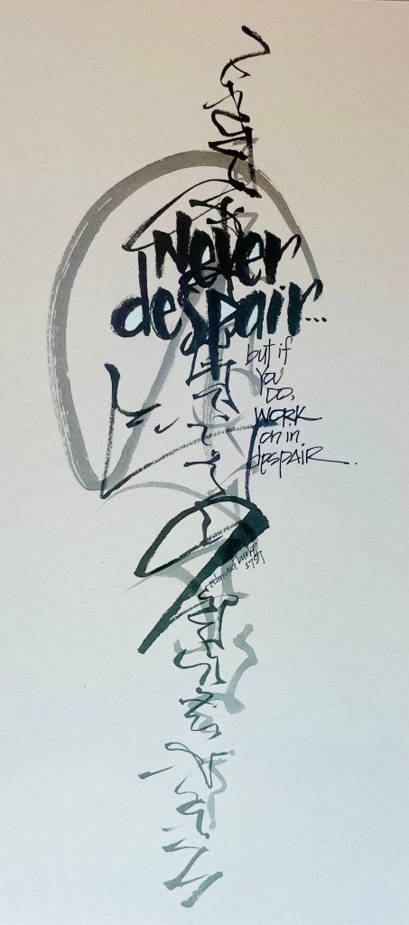 How do we do that? I like Edmund Burke’s suggestion, work on in despair. When I feel sad, filled with despair, I know that sometimes getting busy with a project or completing one that is in progress helps me work out my emotional kinks. It gives me time to think, keep going, cry it out in private which eventually rounds off my rough emotional edges. I am tired emotionally and physically, and yet I can look back on my physical efforts to see progress and a light at the end of the tunnel. In other words, I work on in despair. I’ve done it many times, and it really does help.
