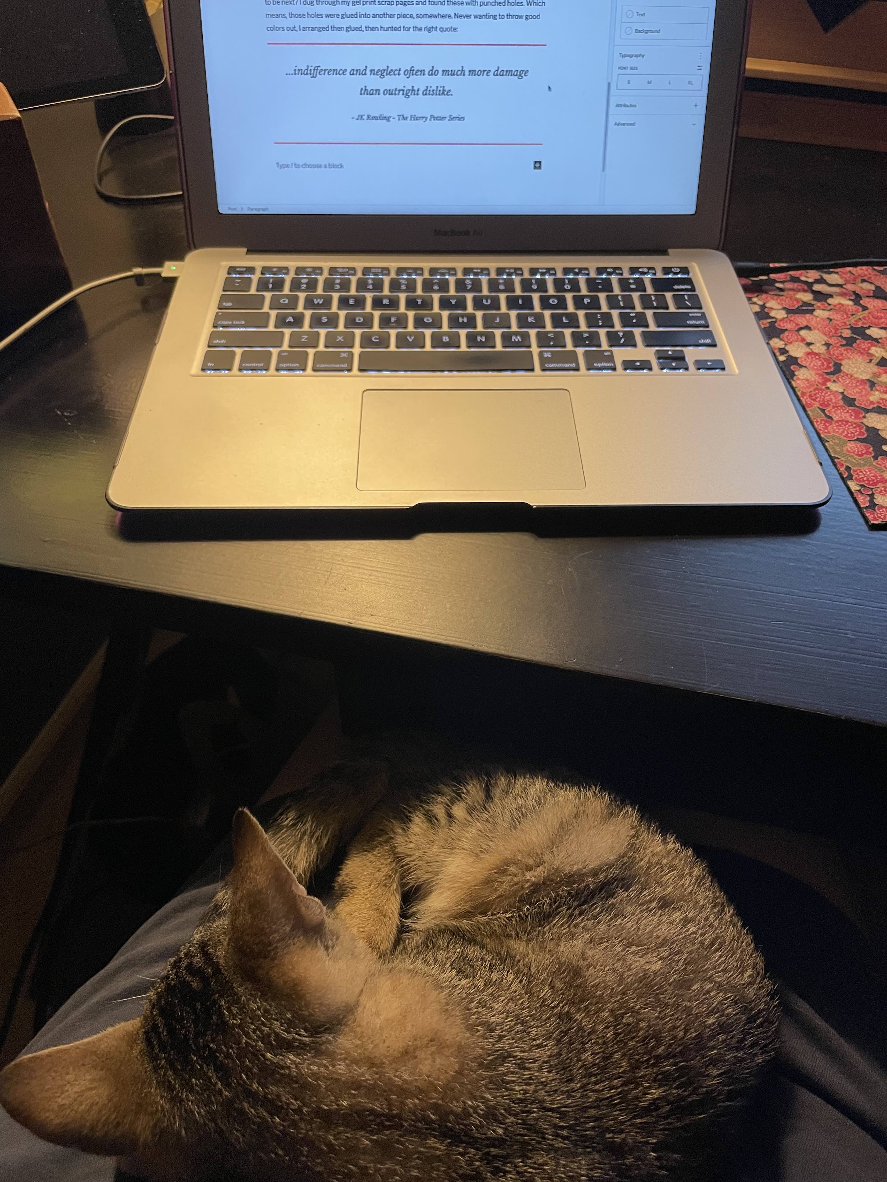 However, there is a bright side to neglect – salvation! I am writing this late at night with our new kitty Saba sleeping on my lap. He is a short hair mackerel tabby. We picked him up two days ago from the county animal shelter. He is three months old, and quite a great fit into our family. He has had his shots, is fixed, has had all the necessary examinations, and was just waiting for someone to care enough to take him home. He was more than happy to come home with us…and he is VERY warm on my lap! I’m not sure if this is going to become a regular thing, yet I can see that it might!