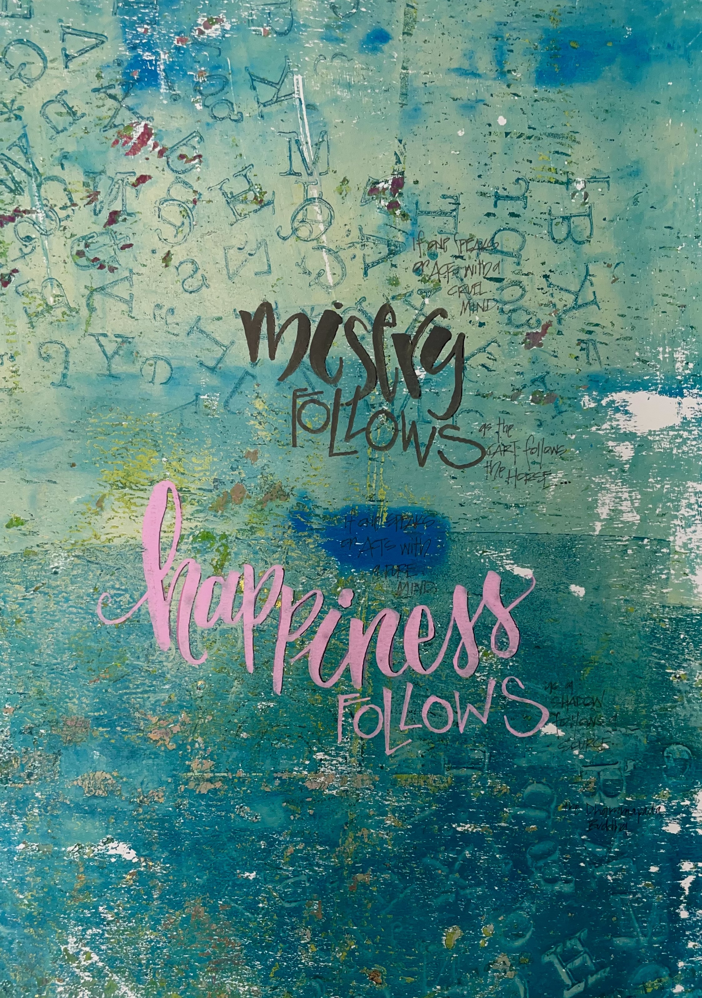 Sometimes the test pages are the best pages! I made a new stamp using plastic stickers I got at the dollar store. I glued them to a block of wood and this was the first gel print a friend created when she tested the stamp. I like all the letters dancing around the page. Here is what the quote says:
