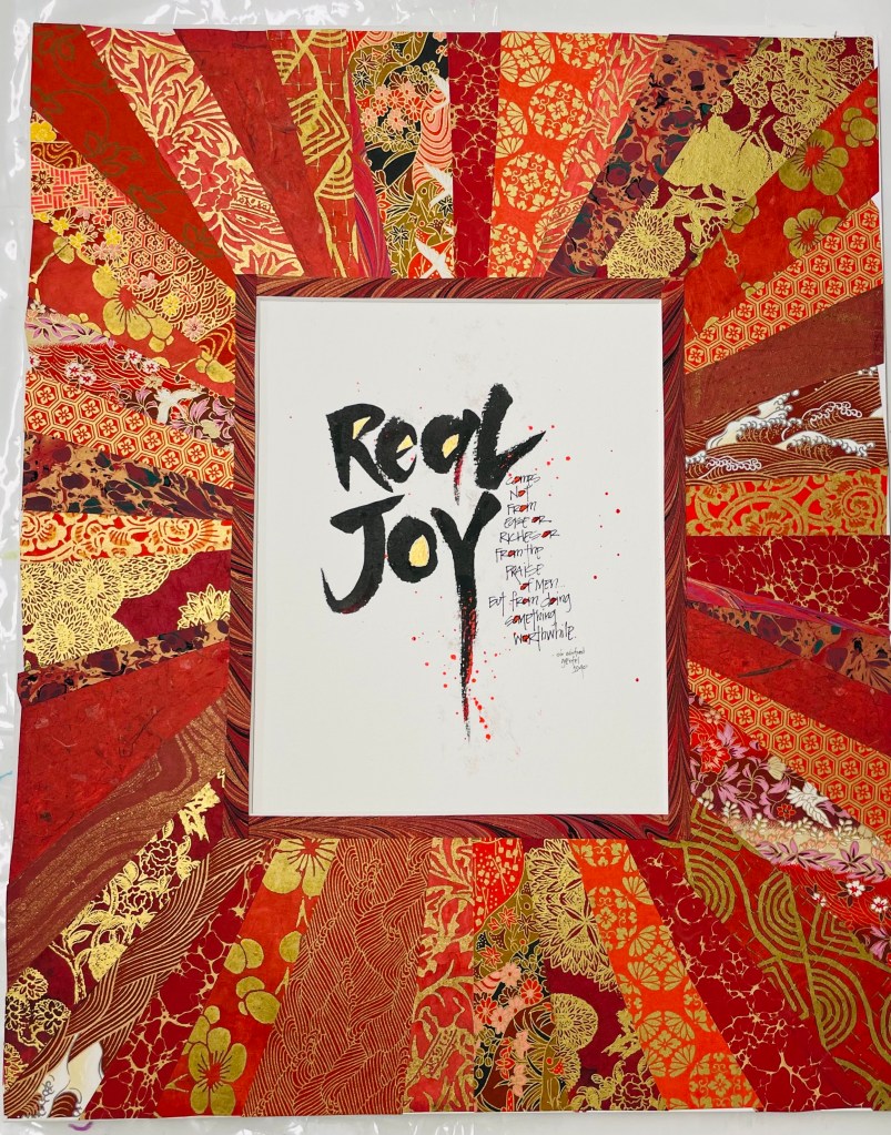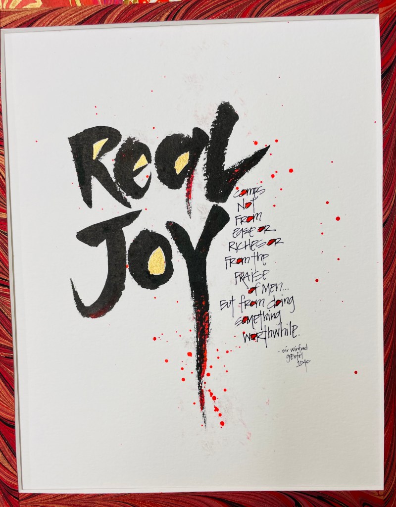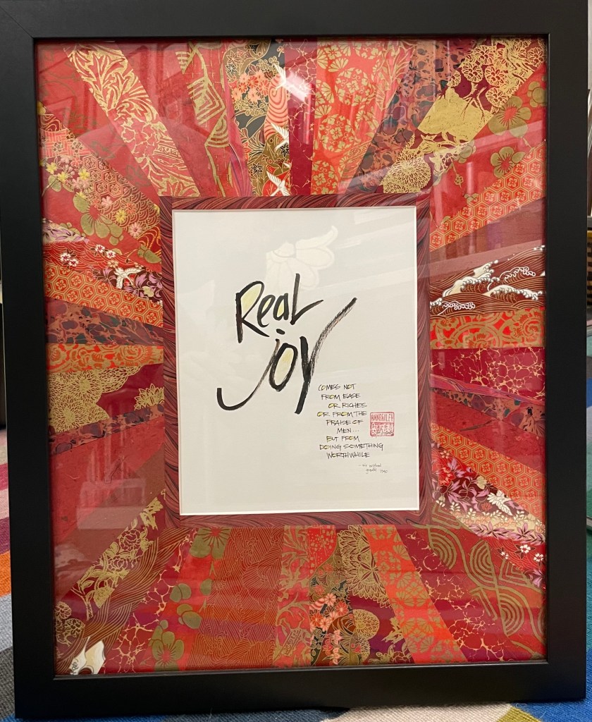 So why do this piece over? I have been looking at it on the wall in one of our guest rooms, and thought it was a little bland. I did it many years ago when my skills and tools were very different than what I do today. I thought the bold, red mat deserved lettering that was a bit more vibrant. I utilized a wide brush with black ink, a brush with red ink, and a fine liner to complete the do over. I am please with it and will finish reframing it once I am certain the ink is completely dry.