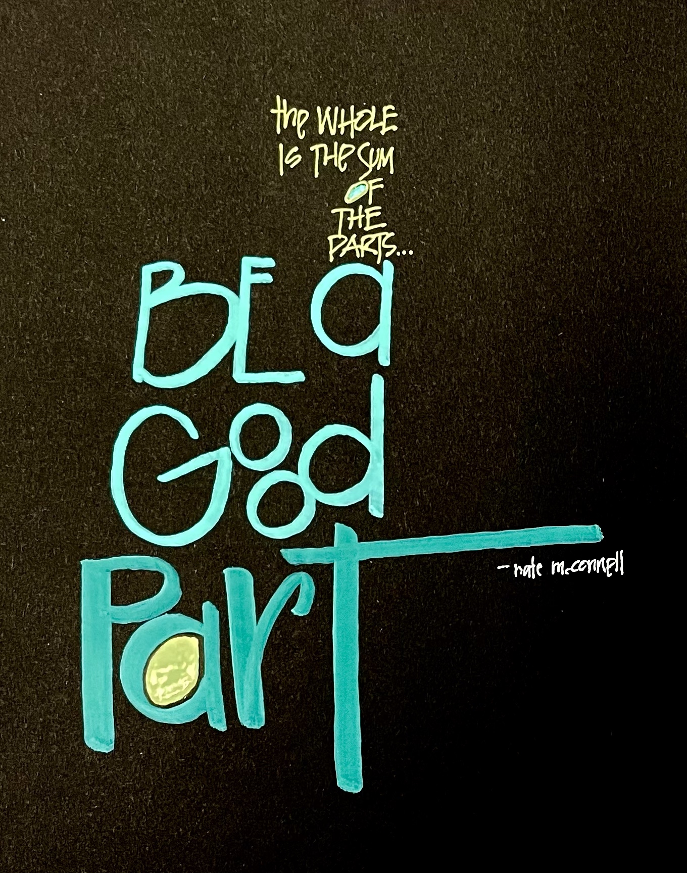 Let me challenge you to being open to becoming a better equipped part in order to serve the whole. It may mean feeling unsure or ill-equipped at first, before you get your sea legs. It may mean doing something menial in order to alleviate someone else’s work load. OR it may even mean stepping into a less important role in order for someone else to have an opportunity to learn how it feels to be in the important role. As Nate McConnell said, be a good part. Do it well, because when the whole is served everyone wins!