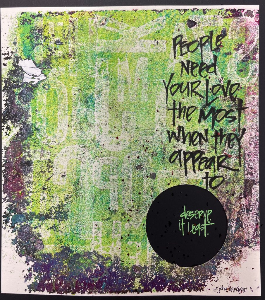 In choosing to work on black paper for Inktober, I am finding myself feeling limited a bit. So I dug through my gel print paper and found this one, cut out the hole, and pasted it onto the black paper. I did that before I found the quote I wanted to utilize. In my quote search, I found these woods from John Harrigan. I love that by writing the final three words – deserve it least – they are emphasized by being written within the black circle.