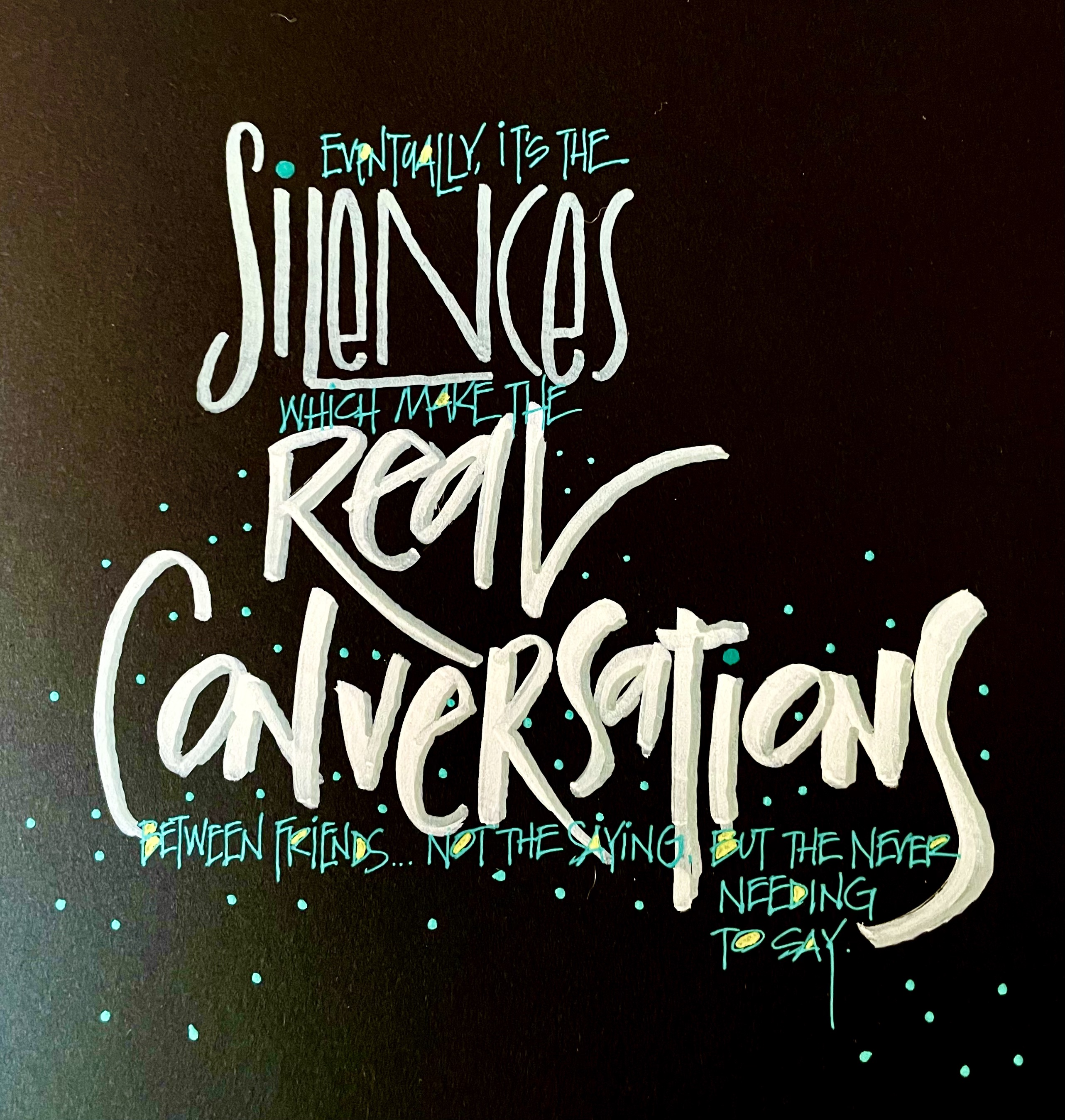 Real conversations do not always need words or sound. They can be sustained by silence. Simply being with someone and letting the silence wash over the moments together has a great power and impact. Knowing that you are safe to be silent is a powerful thing. It reminds us that we are known, we are appreciated, and loved even if we do not use words. And then once the words do come, they mean more and we listen better as we had time to ponder and pause in the silence.
