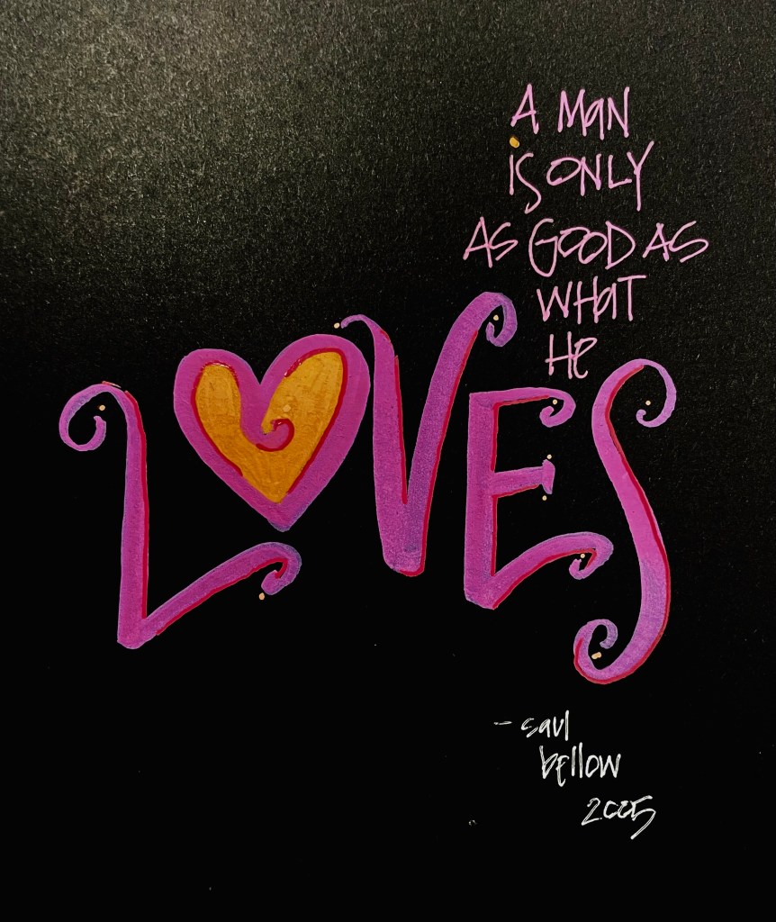 ‘Love’ can be an often misused word. We talk about foods that we love, outfits, places, activities, and in the next breathe talk about people we love. The challenge becomes that we have watered down the word such that our adoration of pizza and people gets described using the same word. I understand how people learning English get our idioms and uses of words confused. These words from Saul Bellow help clarify this: