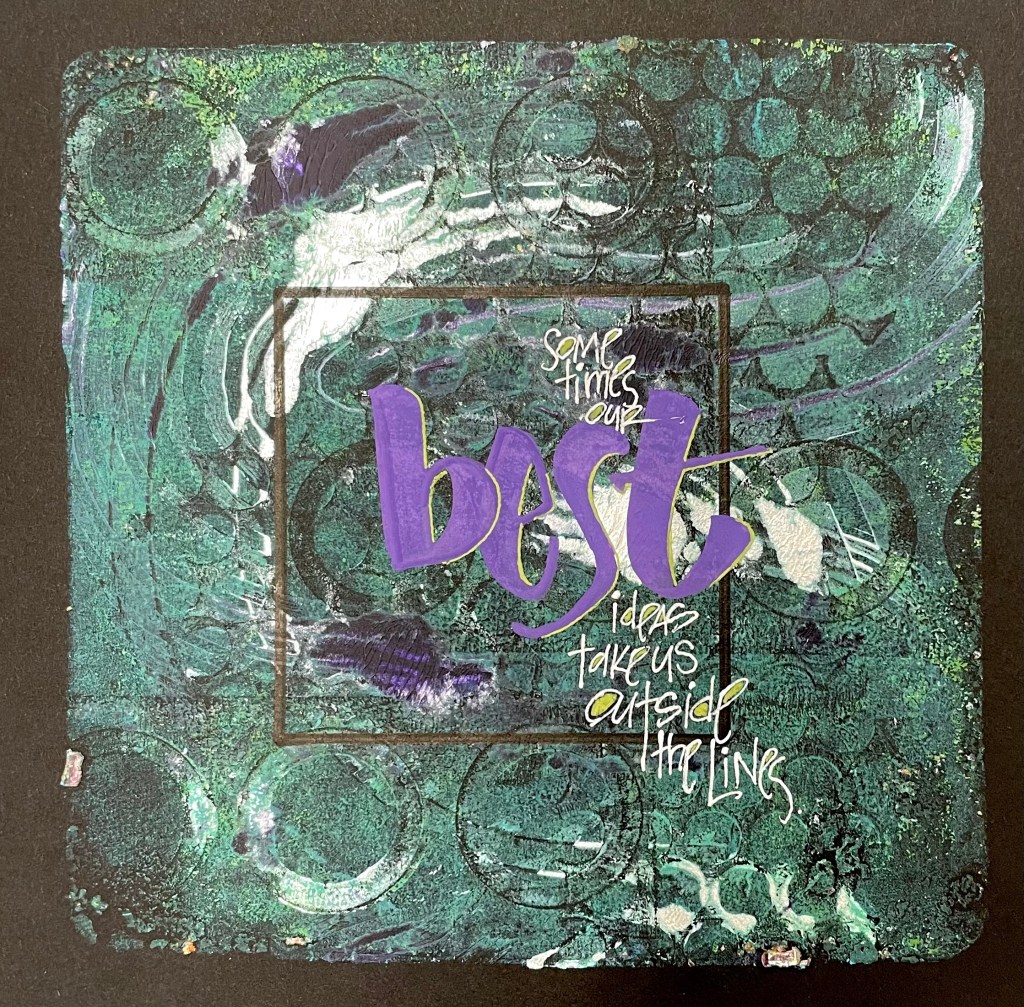 So what does being organized have to do with life going outside the lines? EVERYTHING! When chaos happens, when things blow up, when people surprise us in both good and bad ways, being organized gives us the freedom to confidently move into the chaos knowing there is a solid structure under our feet. When a student arrives without the right supplies, I am organized and I am ready. When they ask a question that does not relate to the topic at hand, being prepared allows me to parking lot that one and come back to it later. And when people want to go off the range – which I ALWAYS hope they will – I can sit back and watch them have fun while they play, and learn and grow.