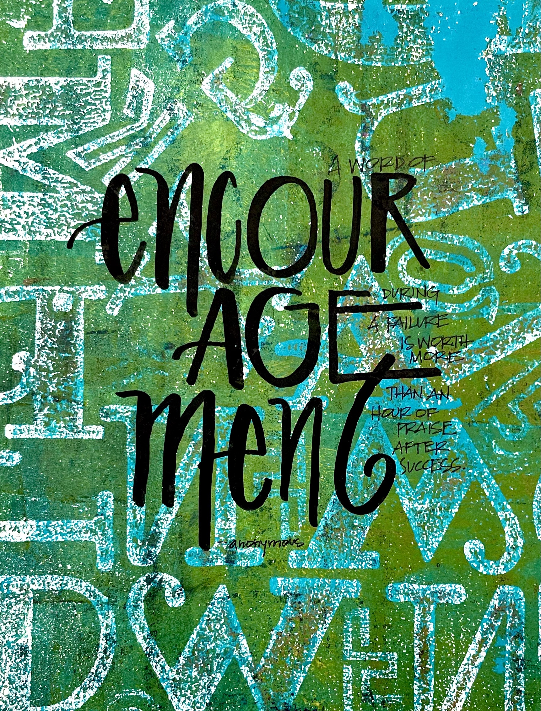 In this class example, we were talking about legibility and readability. How to know when to break up a word from a creative perspective, or just leave the word in its normal format. I intentionally broke up the word encouragement so my students could see what I meant. I then wrote the text of the quote in very small letters, which forces people to look very close to read the words…which lead us to a great discussion on legibility. Here is the quote:
