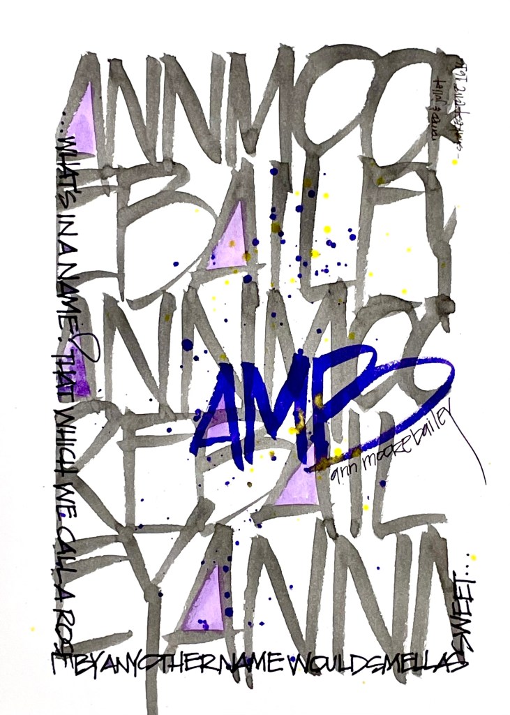 For our online group we were tasked with creating something with our name. Yesterday I was cleaning off my work area in my studio, as I usually do about once a week. Somehow I always end up creating within a twelve inch space because of all the tools I bring out…anyway! I wrote my name over and over again with a sumi ink brush, then wrote my initials with an ink brush pen, and finished by writing my name and this quote from William Shakespeare in .05 ink: